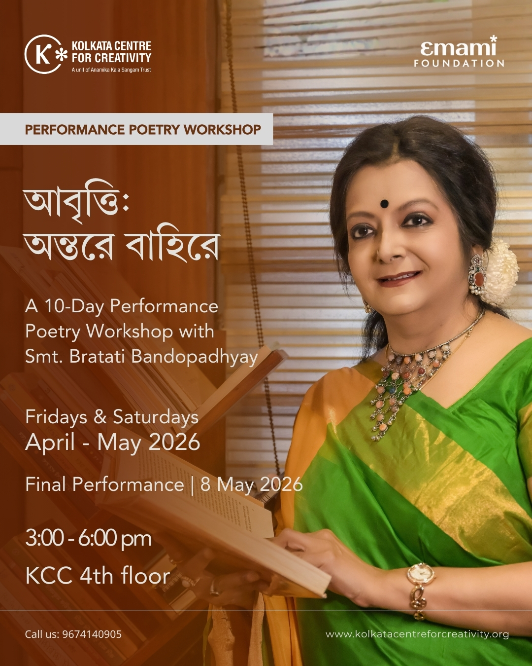 Kolkata Centre for Creativity presents a 10-day Performance Poetry Workshop, আবৃত্তি: অন্তরে বাহিরে with acclaimed artist Smt. Bratati Bandopadhyay. Across weekends in April and May, participants will explore the nuances of Bangla recitation, including voice modulation, tone, rhythm, and emotional expression.