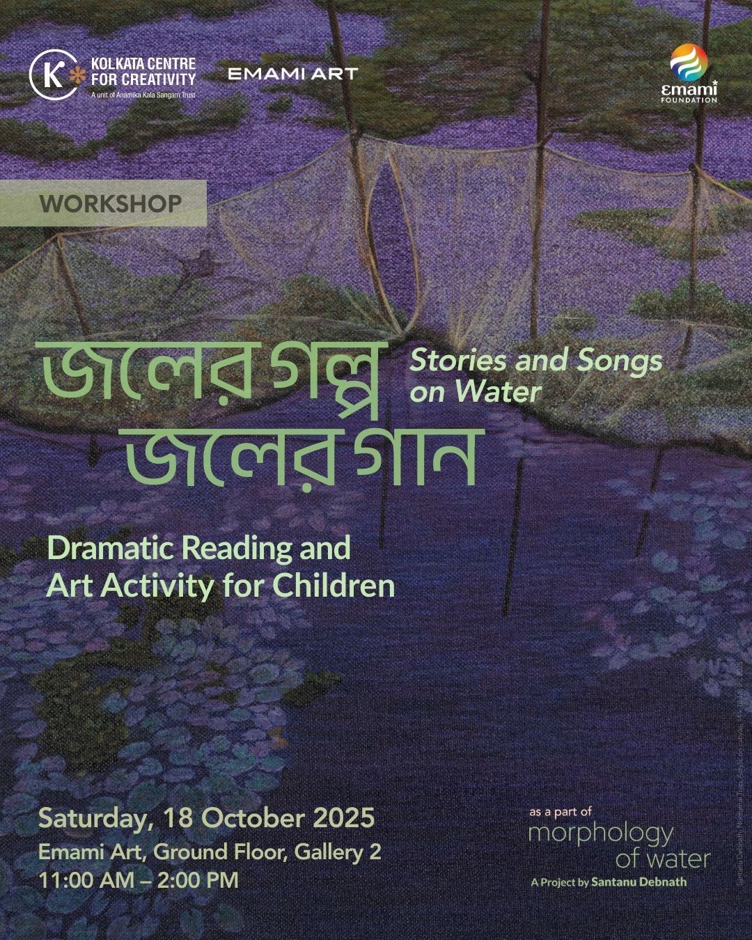 This workshop is a public-facing programme under Morphology of Water: A Project by Santanu Debnath – a solo exhibition at Emami Art (29 August – 18 October 2025). We offer the young cohort a rich opportunity to learn about the climate concerns surrounding waterbodies, study relevant children’s literature, and apply them with empathy in their own creative practice.