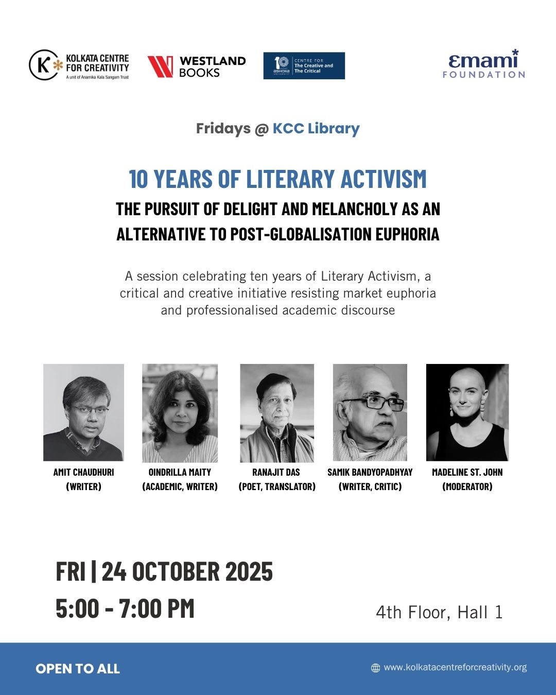 Marking a decade of Literary Activism, this special session of Fridays at KCC celebrates a critical alternative to globalisation’s literary buzz. Originating in annual symposia from December 2014, developing a website (literaryactivism.com), and now operating a publishing imprint at Ashoka University’s Centre for the Creative and the Critical, Literary Activism carves out space for conversation among writers, artists, translators, publishers, and academics. Distinct from conventional activism, the initiative is a form of serious play, encouraging creative exploration over immediate outcomes. Its project aims to free critical discussion from both academic custodianship and the routine celebrations of book launches, making room for dissent, delight, and melancholy in literary practice even as globalisation narrows opportunities for genuine engagement in festivals and conferences.