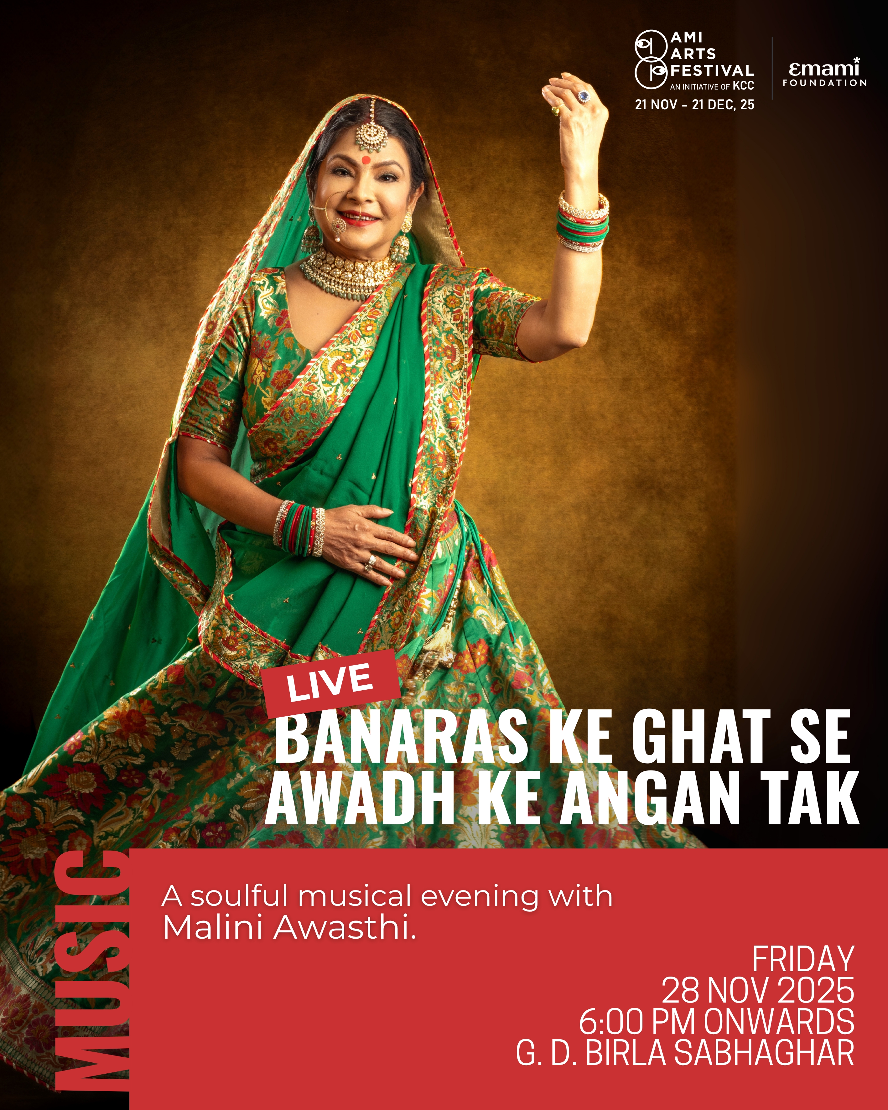 Banaras ke Ghat se Awadh ke Angan Tak celebrates the living traditions of Hindustani folk music through the artistry of Padmashree Malini Awasthi. Her repertoire includes folk and semi-classical forms such as thumri, dadra, and kajri in Awadhi, Bhojpuri, Braj, and Bundeli. Her performance traces the journey of folk music as a living archive of community, history, and collective memory, and creating a vibrant blend of devotion, storytelling, and regional poetry, steeped in the musical traditions of Banaras and Awadh.