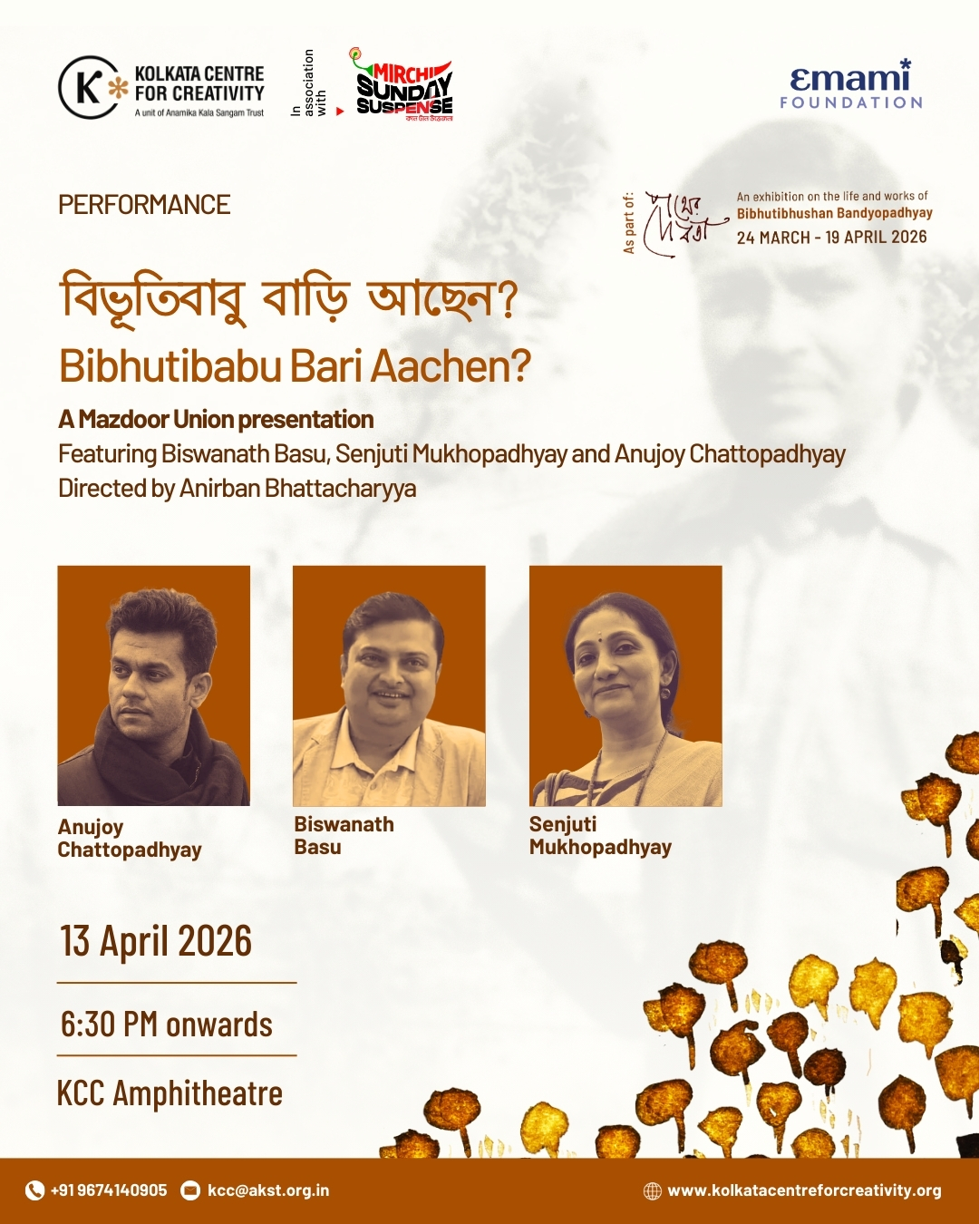 Kolkata Centre for Creativity presents বিভূতিবাবু বাড়ি আছেন?, a dramatized reading that brings together characters from the works of Bibhutibhushan Bandyopadhyay in a staged performance with music.