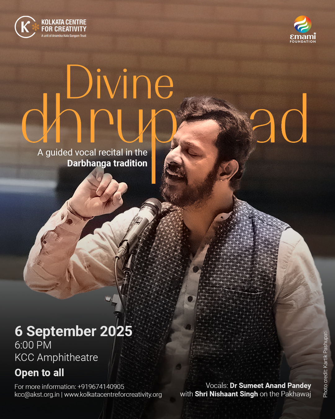 In Divine Dhrupad, Dr. Sumeet Anand, grandson of the legendary Padmashri Pandit Siyaram Tiwari, carries forward the Darbhanga tradition with profound artistry and authenticity. Trained by Pandit Abhay Narayan Mallick and Pandit Indra Kishore Mallick, he brings an unbroken lineage to life, blending purity of form with emotional depth. Accompanied by Shri Nishaant Singh on the Pakhawaj, the recital will culminate in Upaj, a spontaneous exchange between melody and rhythm that celebrates both tradition and creative freedom.