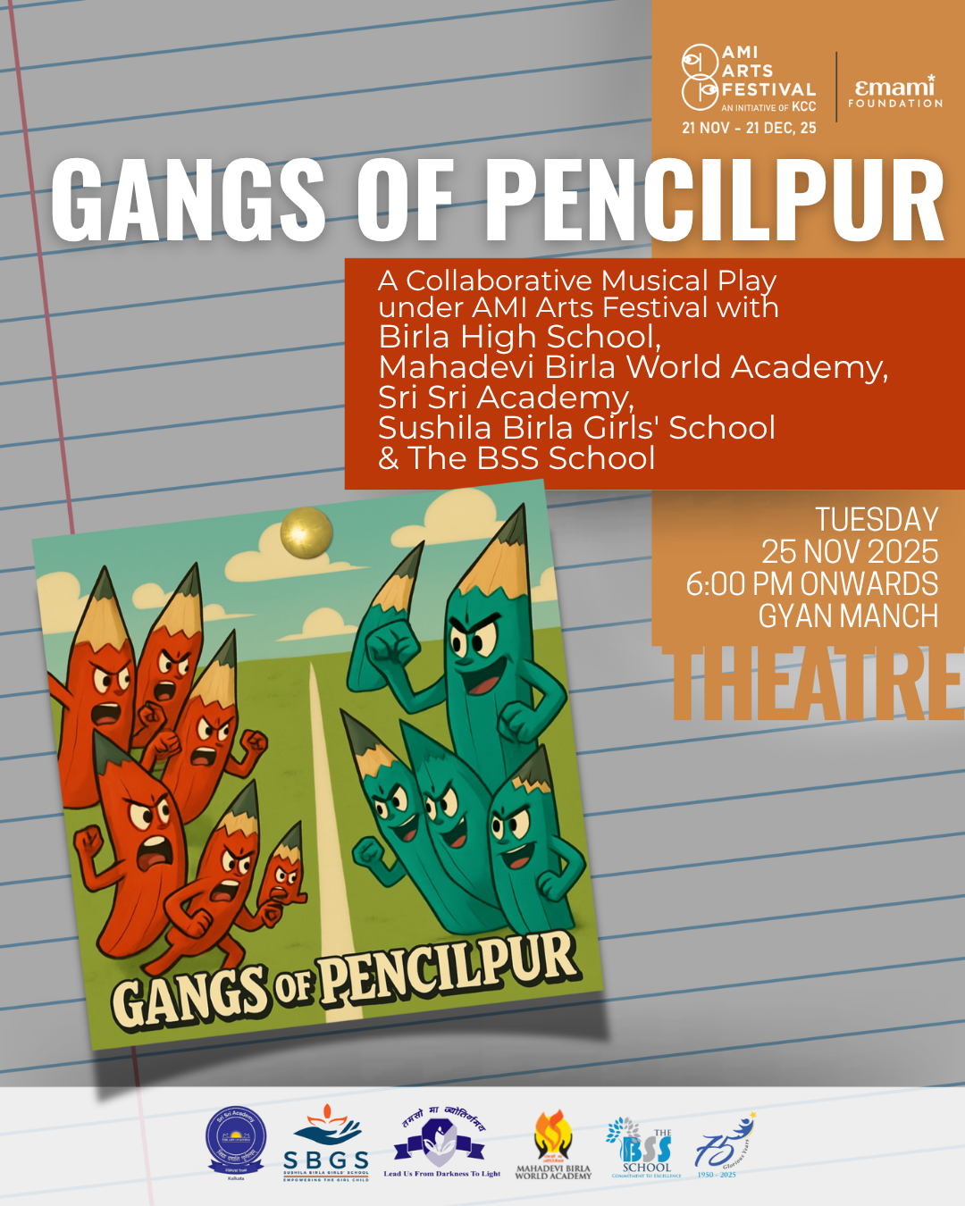 Kolkata Centre for Creativity proudly presents Gangs of Pencilpur, a collaborative school concert under this year’s AMI Arts Festival. Featuring students from Classes 6–11 across five leading Kolkata schools—Birla High School, Mahadevi Birla World Academy, Sri Sri Academy, Sushila Birla Girls’ School, and The BSS School—the play is an allegory set in Pencilpur, where Red and Blue Pencils face off in conflict.