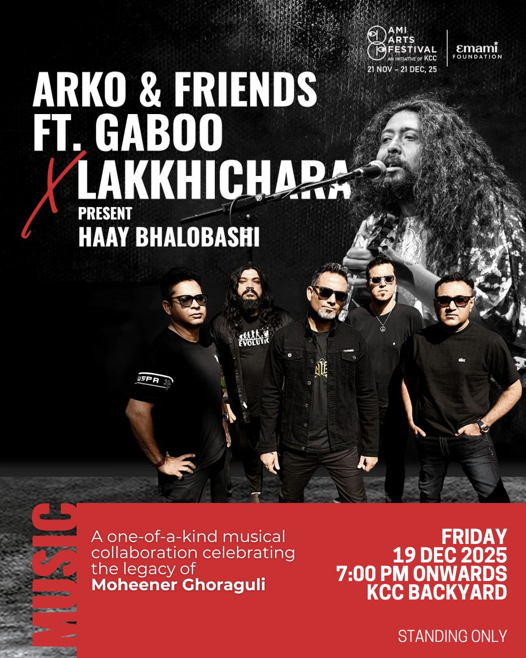 As a part of AMI Arts Festival 2025, Kolkata Centre for Creativity presents Haay Bhalobashi, a collaborative stage experience where Lakkhichhara’s powerful rock sound meets the soulful, multicultural music of The Arko Mukhaerjee Collective honouring the legacy of Moheener Ghoraguli, the cult classic Bangla band.