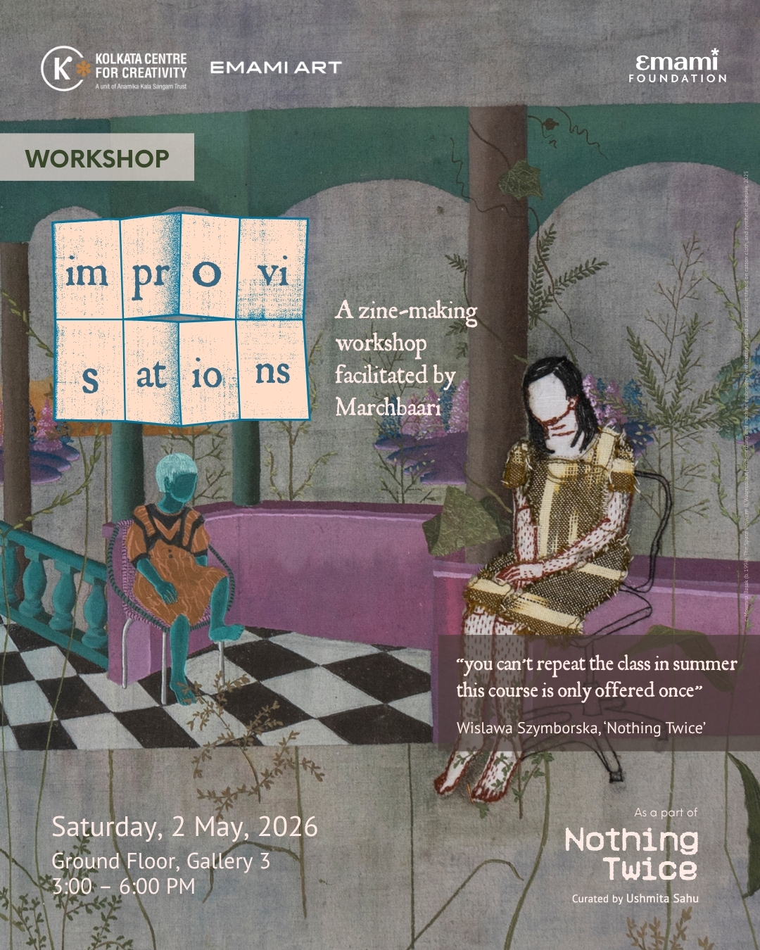 Emami Art in collaboration with KCC presents a zine-making workshop as a public-facing programme under Nothing Twice curated by Ushmita Sahu on view till 9 May 2026 at Emami Art.