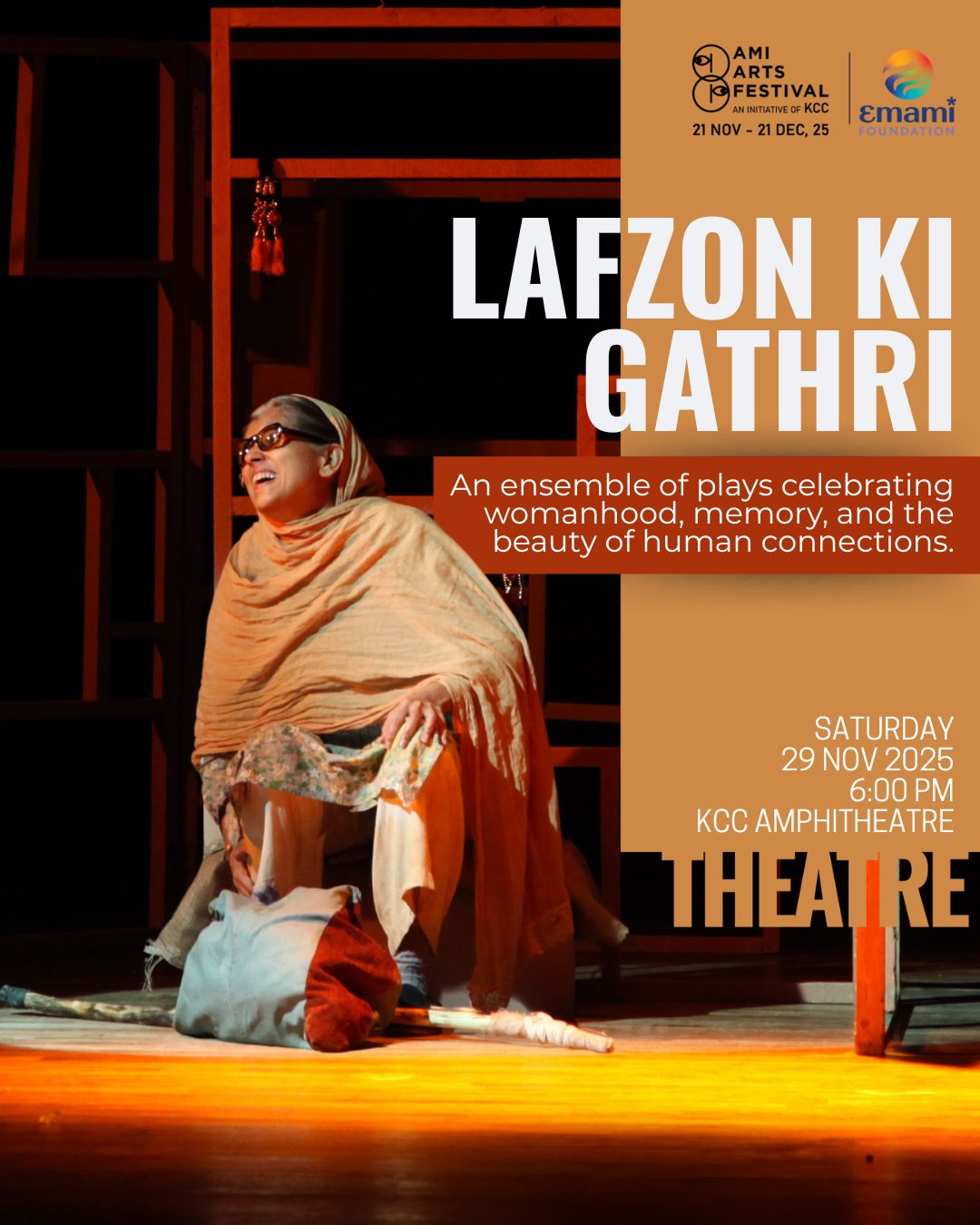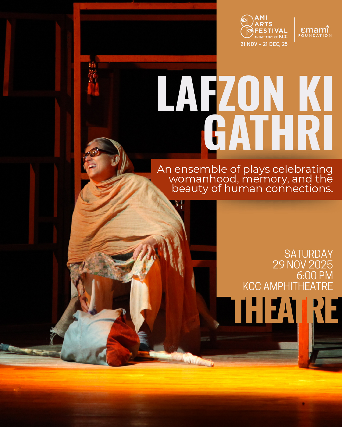 At the AMI Arts Festival 2025, Kolkata Centre for Creativity is honored to present Lafzon Ki Gathri, an anthology of plays directed by Seema Bhargava Pahwa and produced by Manukriti Pahwa.