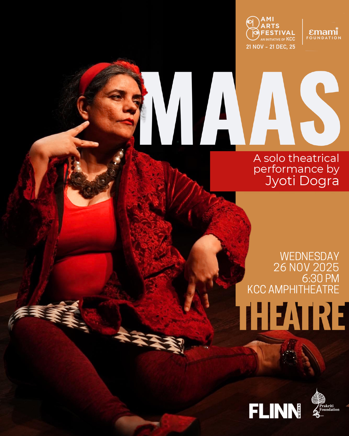 Under AMI ARTS FESTIVAL 2025, Kolkata Centre for Creativity is proud to host Maas, a powerful solo performance by Jyoti Dogra, one of India’s most respected voices in contemporary theatre.
