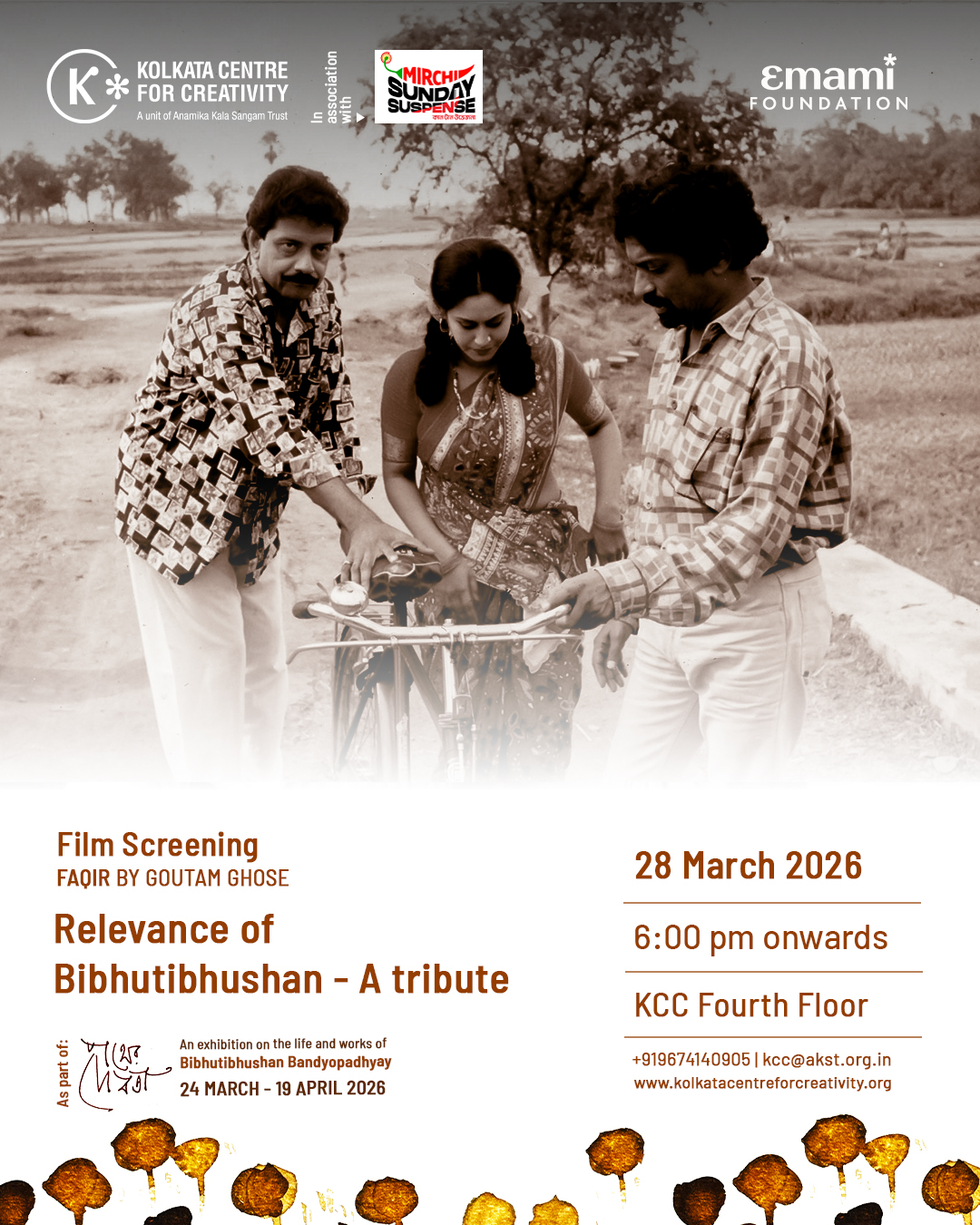 Kolkata Centre for Creativity presents a screening of Faqir, a short art film directed by acclaimed filmmaker Goutam Ghose. The film is an adaptation of the short story Faqir by Bibhutibhushan Bandyopadhyay, the celebrated Bengali author known for his deeply humane portrayals of rural life and the struggles of ordinary people.
