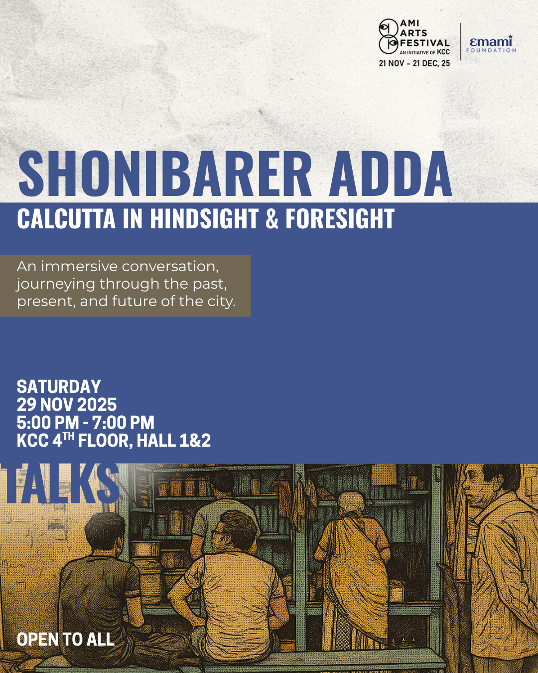 Through conversation, music, art, and poetry, the adda unfolds in three movements - Hindsight, Insight, and Foresight, led by historians, heritage practitioners, and passionate citizen voices. The panel features Prof. Shrimoyee Guha Thakurta, Iftekhar Ahsan, Dr. Debasis Bose, Pradeep and Bonani Kakkar, and will be moderated by Mrinalini Majumdar. Together, they explore what Calcutta once was, what it has become, and what it might yet become.