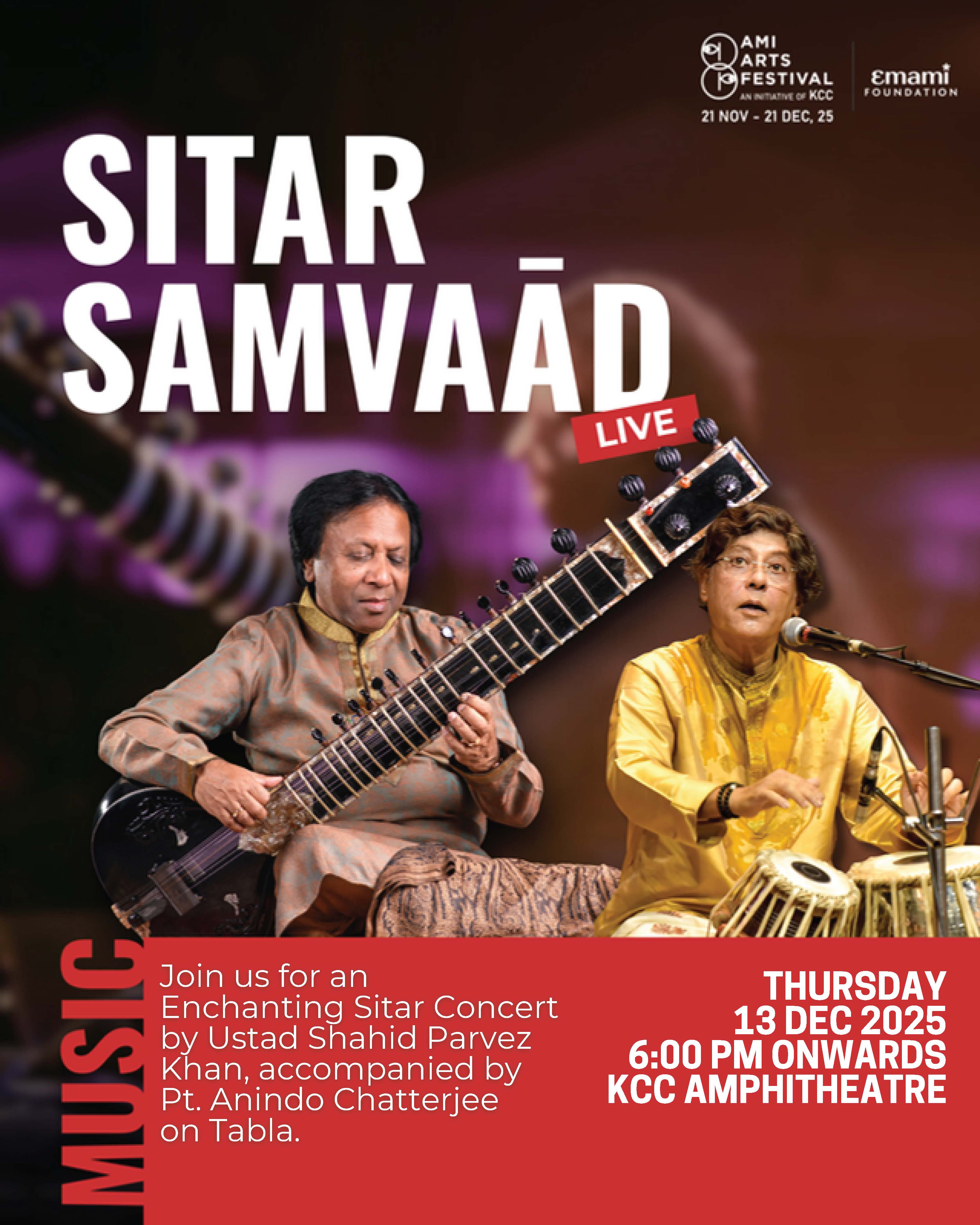 As part of AMI Arts Festival 2025, Kolkata Centre for Creativity is honoured to present Sitar Samvaad, a rare musical evening where two of the greatest living masters of Indian classical music share the stage. Experience the sublime artistry of Ustad Shahid Parvez Khan, one of the foremost exponents of the Etawah Gharana and a sitarist of extraordinary depth, accompanied by Pt. Anindo Chatterjee, the tabla virtuoso celebrated worldwide for his precision, clarity, and rhythmic mastery.