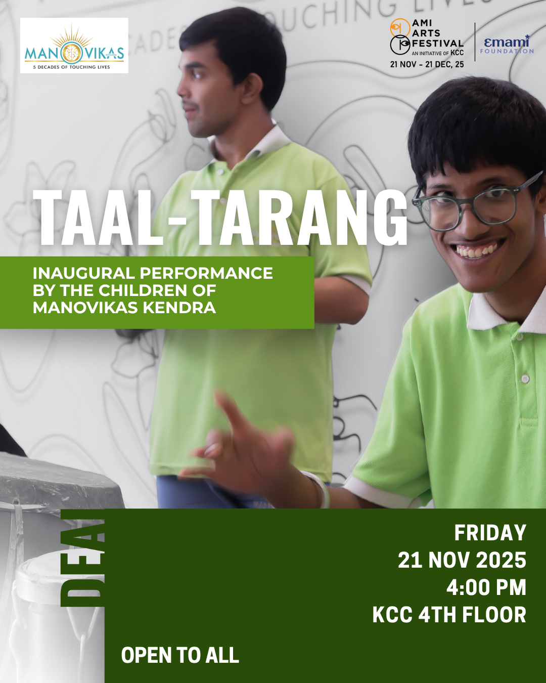 The performance also honours the enduring collaboration between Kolkata Centre for Creativity and Manovikas Kendra, an ongoing partnership that champions accessibility and arts education. Join us at 4:00 pm on the 4th floor as Taal-Tarang opens the festival with the power of music that connects and uplifts us all.