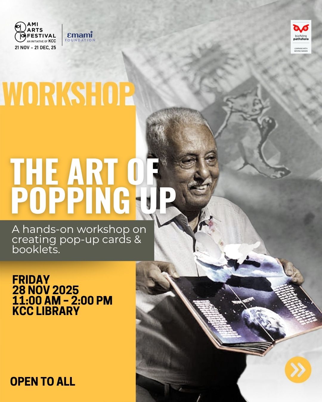 Kolkata Centre for Creativity, in collaboration with Bichitra Pathshala presents The Art of Popping Up, a hands-on workshop introducing the craft of making pop-up cards and paper booklets. Under the guidance of Pradip Sengupta, Kolkata-based geologist and pop-up artist, the workshop welcomes beginners to learn how simple folds and cuts can help them create a beautiful paper craft. ]