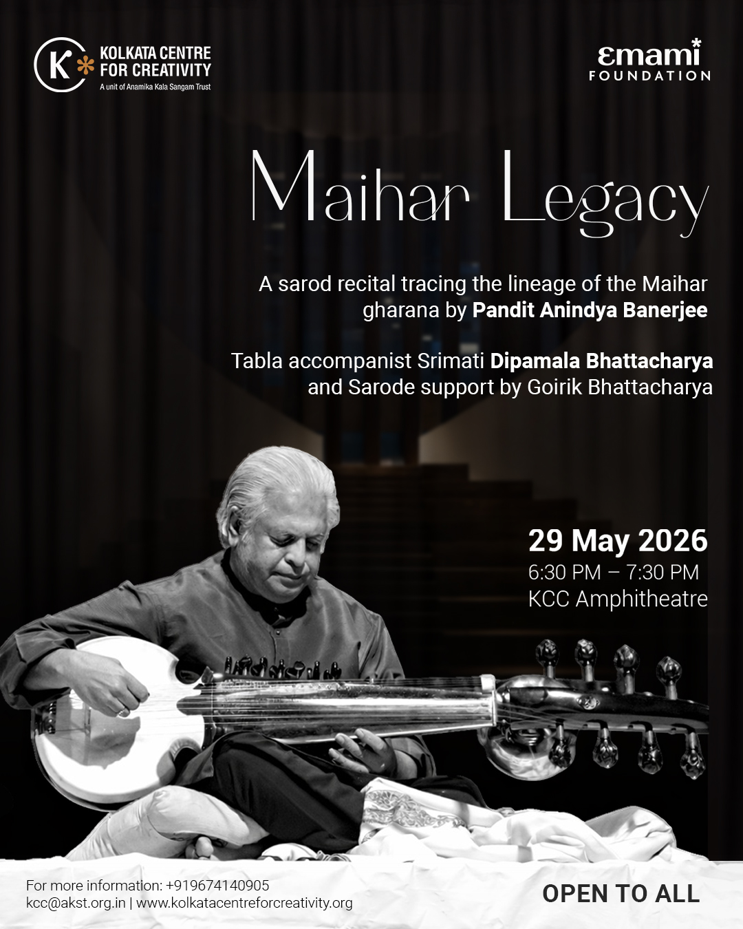 Kolkata Centre for Creativity presents The Maihar Legacy, a sarod recital by Pandit Anindya Banerjee, celebrating the rich lineage of the Maihar gharana.